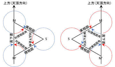 また、∠MM'S(対実相距角)は、方向角の算出に影響する。方向角は、上方を